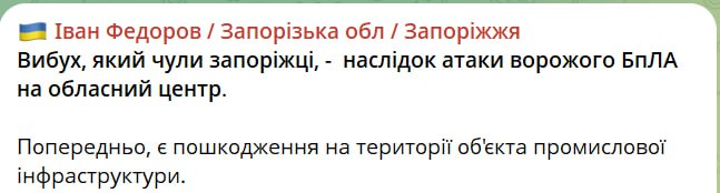 Запорожье подверглось атаке БПЛА, сообщил глава ОВА Федоров.