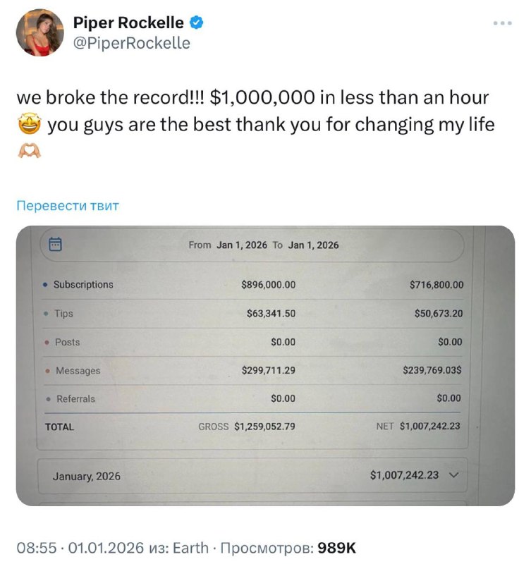 $1,000,000 за один час — онлифанщица похвасталась суммой, которую заработала в новогоднюю ночь, просто выложив свои нюдсы.