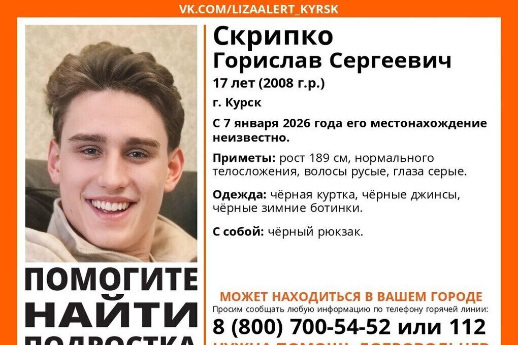 В Курске пропал 17-летний подросток Пропал Скрипко Горислав Сергеевич, 17 лет, город Курск. Его местонахождение неизвестно с 7 января 2026 года. Жесть Курск — подписаться