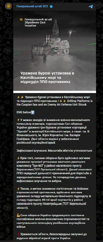 ВСУ поразили буровые установки «Лукойла» в Каспийском море Эти объекты обслуживали российскую оккупационную армию, заявляют украинские военные. Кроме того: В оккупированной Луганской области был нанесён удар по комплексу ПВО — «Бук-М3». Также прилетело по складу материально-технического подразделения 49-й армии оккупантов на временно оккупированной территории Херсонской области. «Дальше будет», — обещают в ведомстве. И в этом нет никаких сомнений. @nexta_live