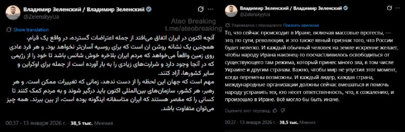 Зеленский о ситуации в Иране написал на персидском языке.