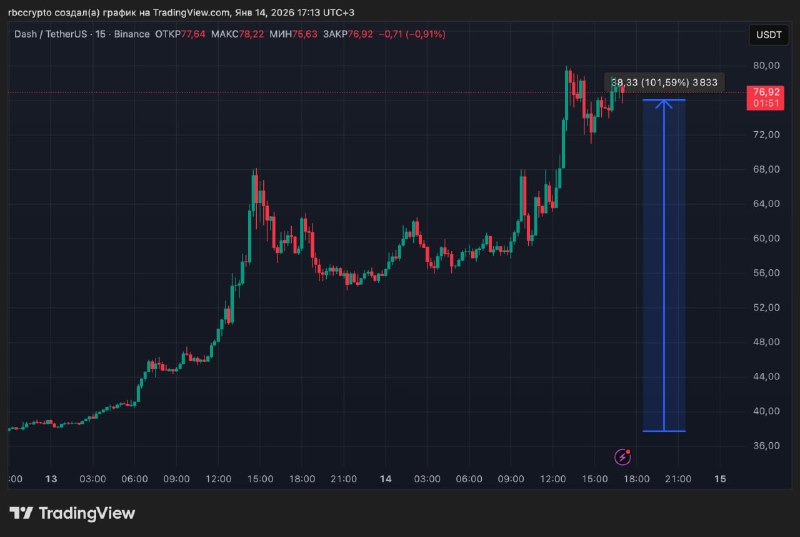 Курс DASH вырос вдвое за сутки. Капитализация анонимной монеты приближается к $1 млрд. Несмотря на заметный рост, DASH торгуется сильно ниже максимума, установленного восемь лет назад, в декабре 2017 года, на отметке $1642. После отката от того рекорда курс DASH по большей части все эти годы колебался в пределах $30–100, лишь на пике бычьего рынка 2021 года поднявшись к $400. Присоединяйтесь к форуму РБК Крипто | Подписаться на канал