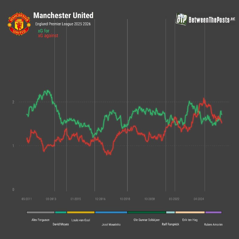 График, который делает больно фанатам МЮ — амплитуда ожидаемых забитых/пропущенных голов МЮ за последние 15 лет.