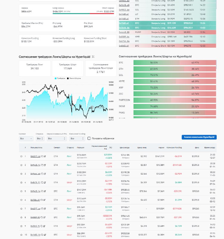 hyperliquid Шорт/лонг 40/60 по количеству в топ 10