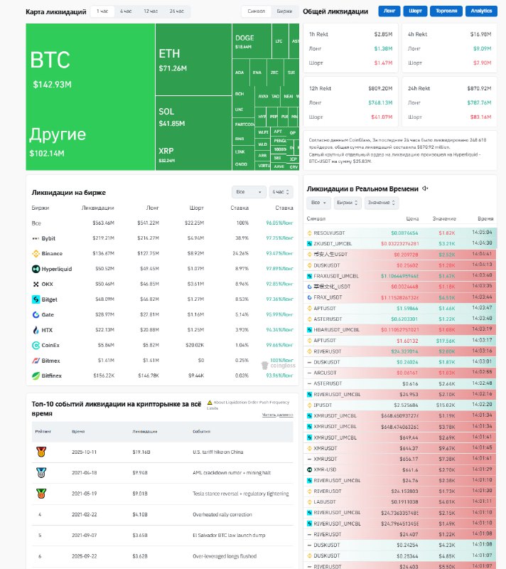 Суточный объем ликвидаций по фьючерсным контрактам превысил $870 млн